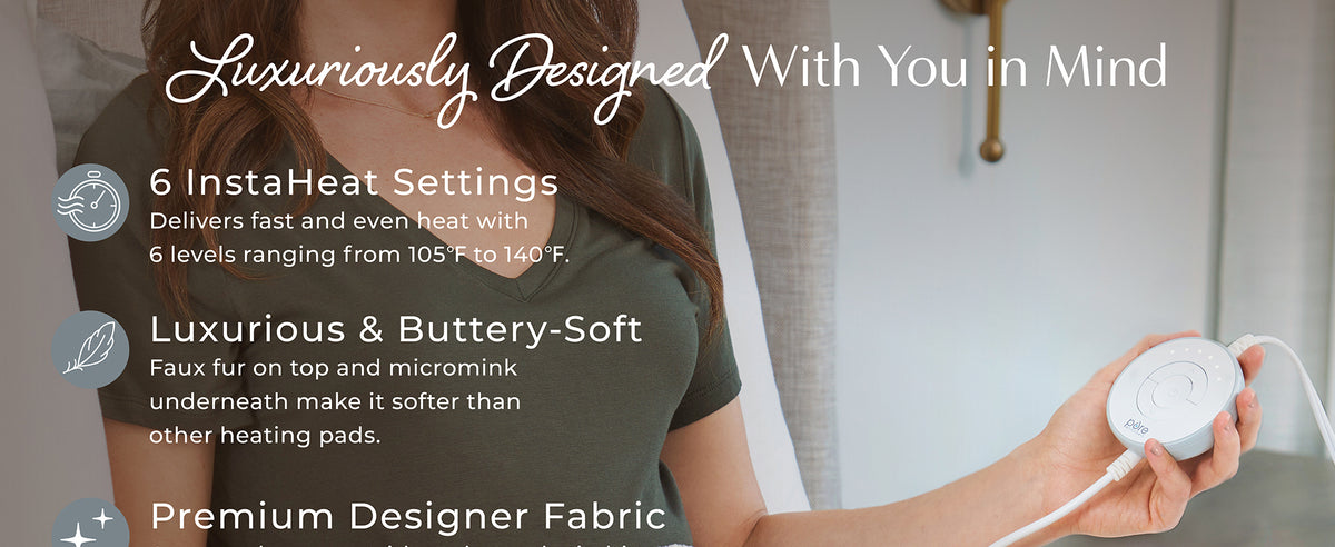 Treat yourself to a new level of decadent heat therapy and comfort with the patented-designed PureRadiance™ Ultra-Wide Luxury Heating Pad by Pure Enrichment®. Inspired by organic, natural elements, this large and stylish 20" x 24" heating pad lets you indulge in luxurious heat therapy. The unique, curated pattern with embossed stitching, meticulous design with a nod to high-end fashion and home decor, elegant hue, and high-quality fabrics of faux fur and micromink that’s ultra-soft and plush to the touch makes this a luxury heating pad that looks as good as it feels. This modern heating pad is designed for the temporary relief of muscle aches, stiff joints, arthritis pain, and menstrual cramps. Easily adjust between 6 therapeutic heat settings with the sleek detachable LED controller. Made with high-end materials including ultra-soft faux fur and micromink that are machine washable, it will maintain its beauty and softness for years to come.