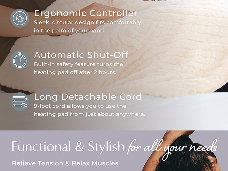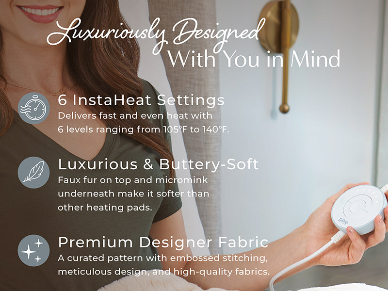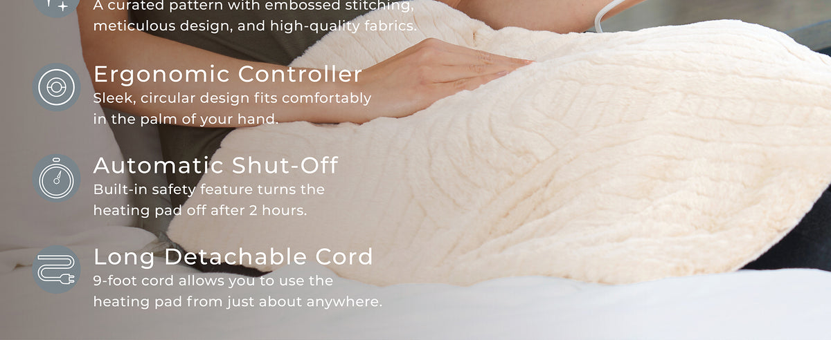 ULTRA-SOFT, PATENTED-DESIGNED HEATING PAD: Inspired by organic, natural elements, this large and stylish 20" x 24" heating pad is a patented design that lets you indulge in luxurious heat therapy. The unique, curated pattern with embossed stitching, meticulous design with a nod to high-end fashion and home decor, elegant hue, and high-quality fabrics of faux fur and micromink that’s ultra-soft and plush to the touch makes this a luxury heating pad that looks as good as it feels.
