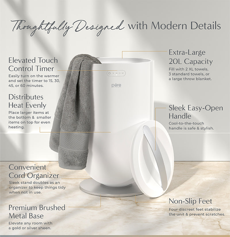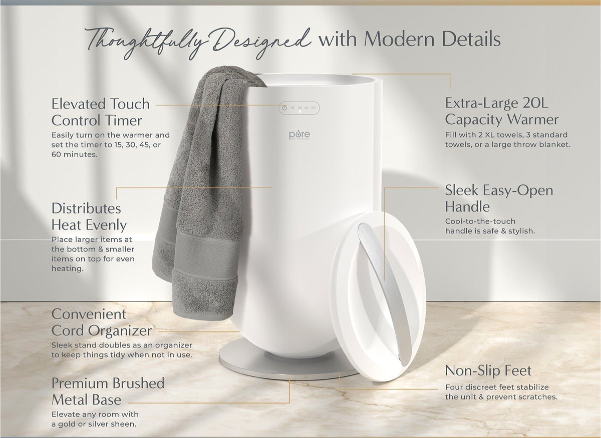 Wrap yourself in comfortable warmth with the PureBliss™ Luxury Towel Warmer by Pure Enrichment®. Perfect for towels, bathrobes, throw blankets, and clothing, the electric towel warmer features a spacious 20L warming bin engineered to distribute heat evenly. Whether you place it in the bedroom, bathroom, closet, or living space, our premium brushed base and handle elevate your home with a subtle sheen. As chic as it is functional, the heated towel warmer provides 4 different heat timer settings on the touch control panel to achieve a perfectly cozy warmth. From post-shower beauty rituals to family movie nights, this product was made to add more delight to your daily routines. PureBliss Luxury Towel Warmer is backed by Pure Enrichment’s industry-leading 5-Year Warranty so your satisfaction is 100% guaranteed.