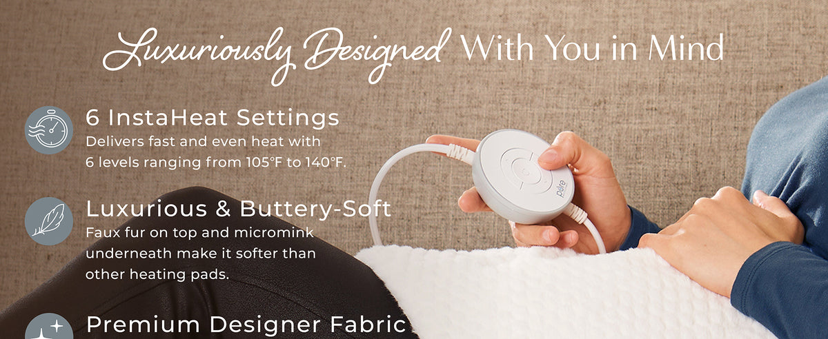 ULTRA-SOFT, PATENTED-DESIGNED HEATING PAD: Inspired by organic, natural elements, this stylish 12" x 24" heating pad is a patented design that lets you indulge in luxurious heat therapy. The unique, curated pattern with embossed stitching, meticulous design with a nod to high-end fashion and home decor, elegant hue, and high-quality fabrics of faux fur and micromink that’s ultra-soft and plush to the touch makes this a luxury heating pad that looks as good as it feels.