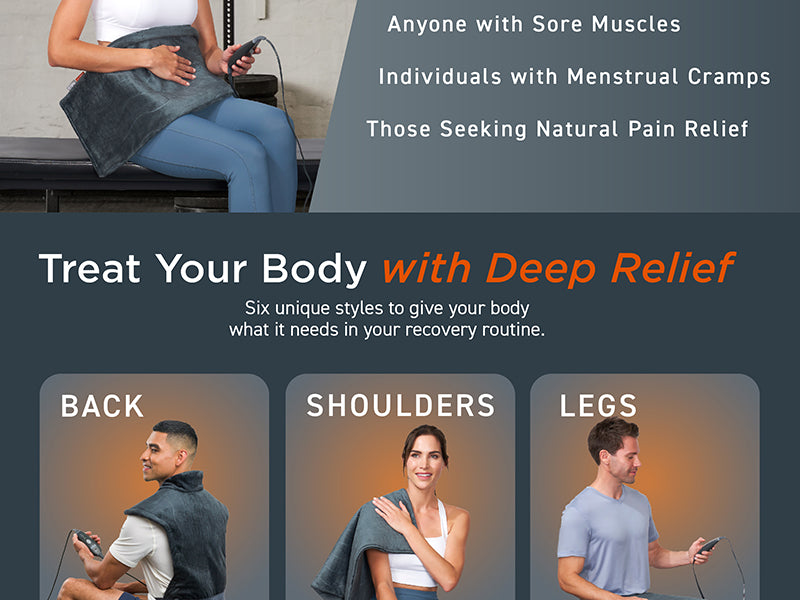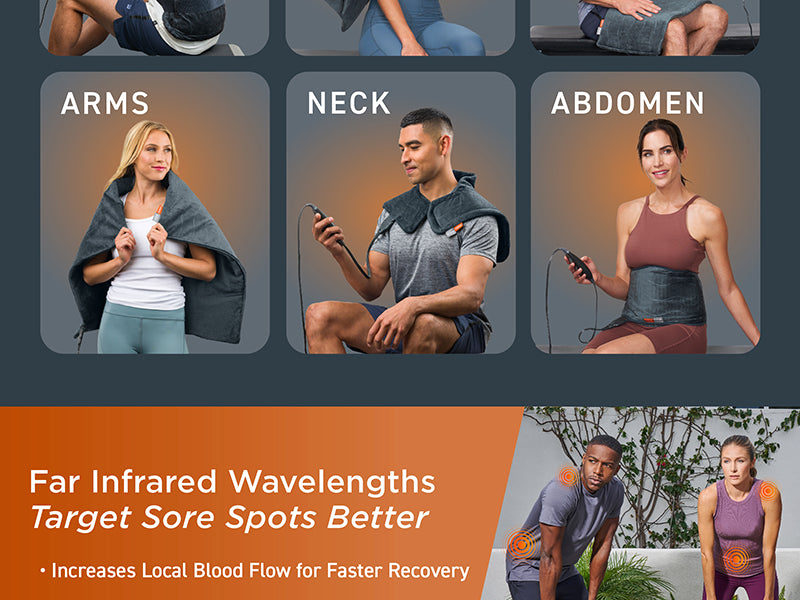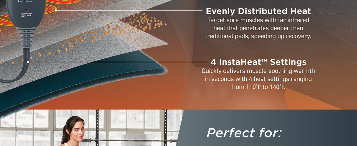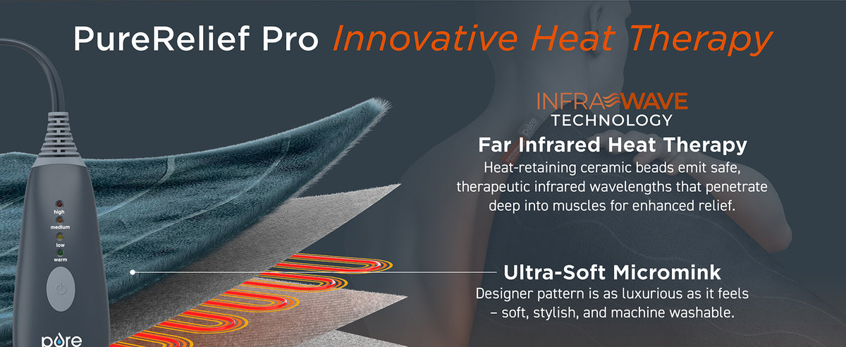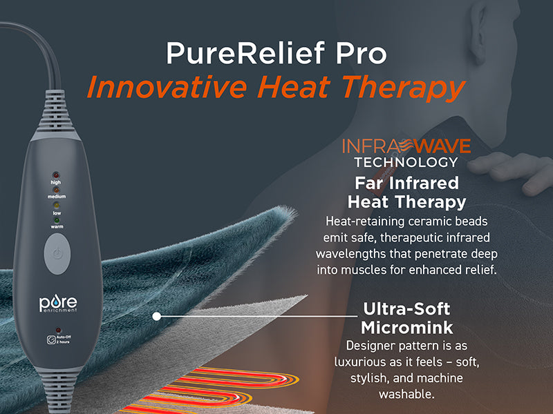 Get deeper relief in your upper back with the PureRelief Pro Far Infrared Neck & Shoulder Heating Pad. Designed with innovative InfraWave™ Technology, this heating pad features a built-in layer of heat-retaining ceramic beads that send safe, far infrared wavelengths below the skin’s surface to target sore spots and penetrate muscles more deeply than traditional heating pads. This revolutionary heating pad provides temporary relief for all of your major and minor muscle aches and pains, including inflammation, joint stiffness, arthritis pain, spasms, and more, while also providing exceptional neck and shoulder pain relief. It’s the best heating pad for athletes, runners, active individuals, and anyone who suffers from chronic pain. Enjoy 4 heat settings from 4 levels of heat ranging from 110-140℉ with the easy-to-use handheld controller. The smart auto shut-off feature will power down the heating pad after 2 hours of continuous use to avoid overheating. Start feeling relief today with the far infrared heating pad from Pure Enrichment®.