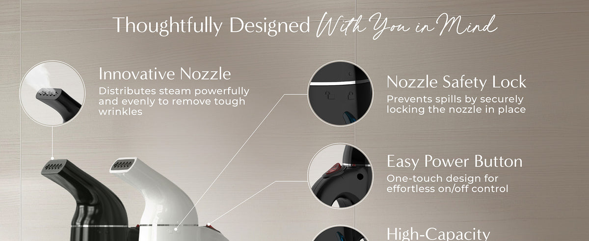 - Auto Shut Off: The convenient safety feature automatically shuts off the portable steamer if it gets too hot or is low on water, while the improved nozzle design distributes steam evenly and consistently, so you can focus the steam exactly where you need it.